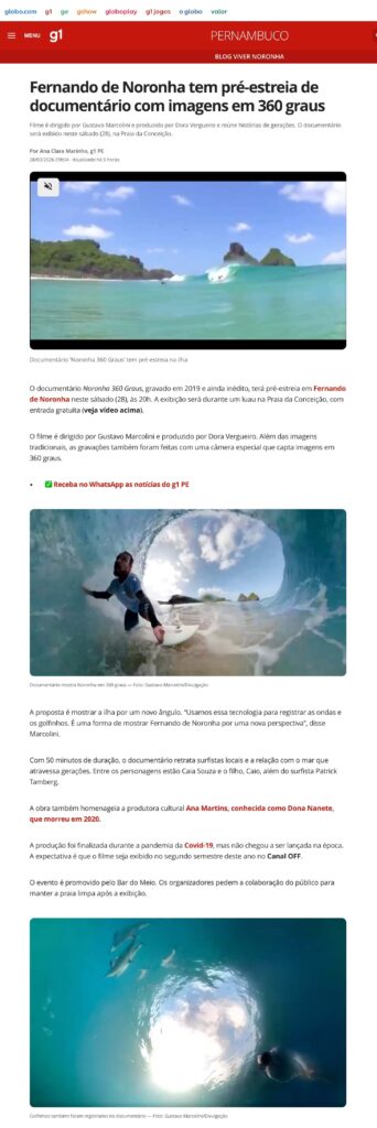 O documentário Noronha 360 Graus, gravado em 2019 e ainda inédito, terá pré-estreia em Fernando de Noronha neste sábado (28), às 20h. A exibição será durante um luau na Praia da Conceição, com entrada gratuita (veja vídeo acima).
