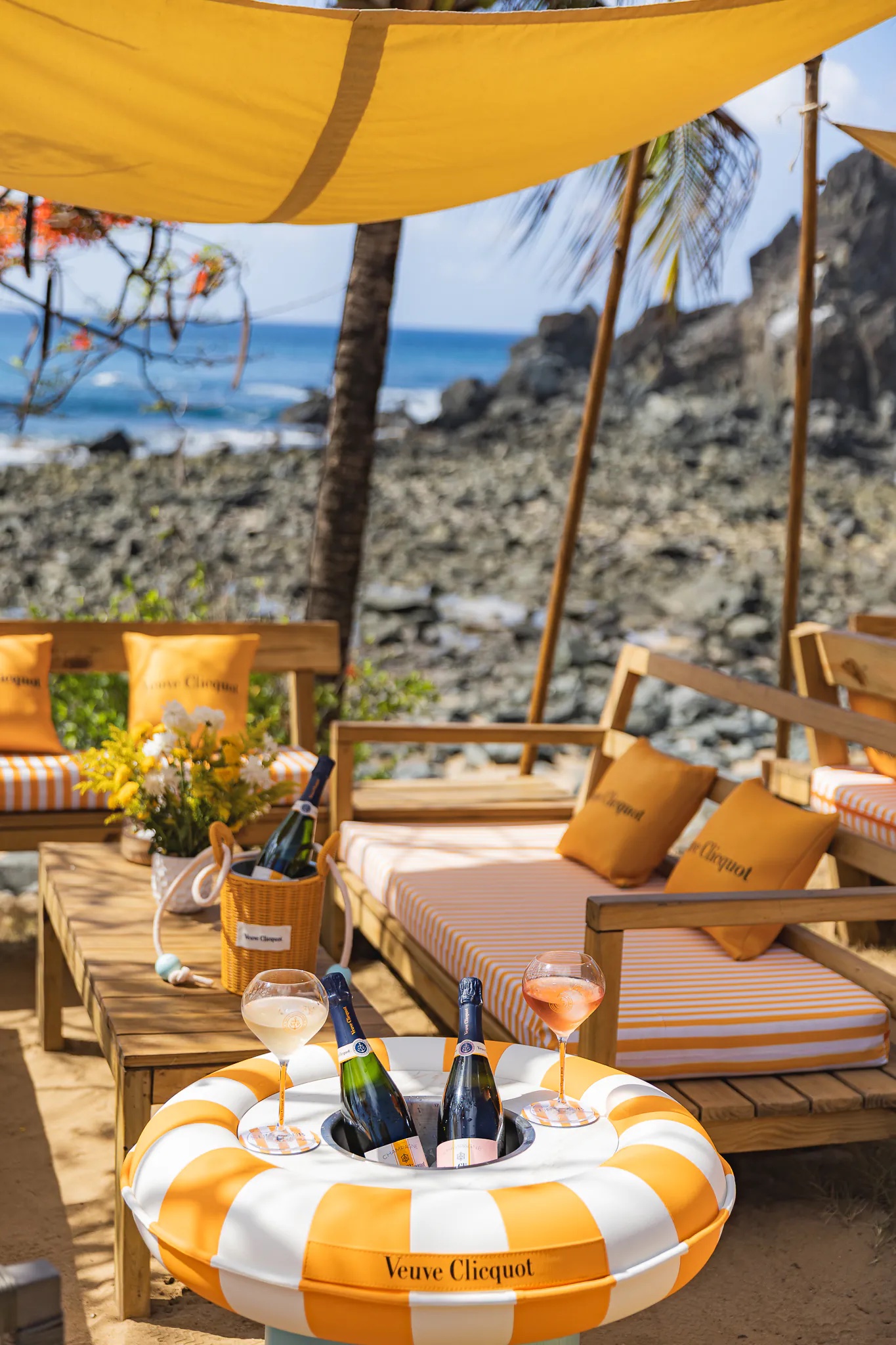 A ambientacao seque o design assinado pelo studio Marcel Poulain. com mobiliário exclusivo, bar personalizado, guarda sois e elementos visuais que conversam com o icônico amarelo da Veuve Clicquot. O resultado é um décor solar, elegante e contemporâneo, que se integra à paisagem da ilha sem competir com ela, evocando o espírito da Riviera Francesa em versão tropical brasileira.